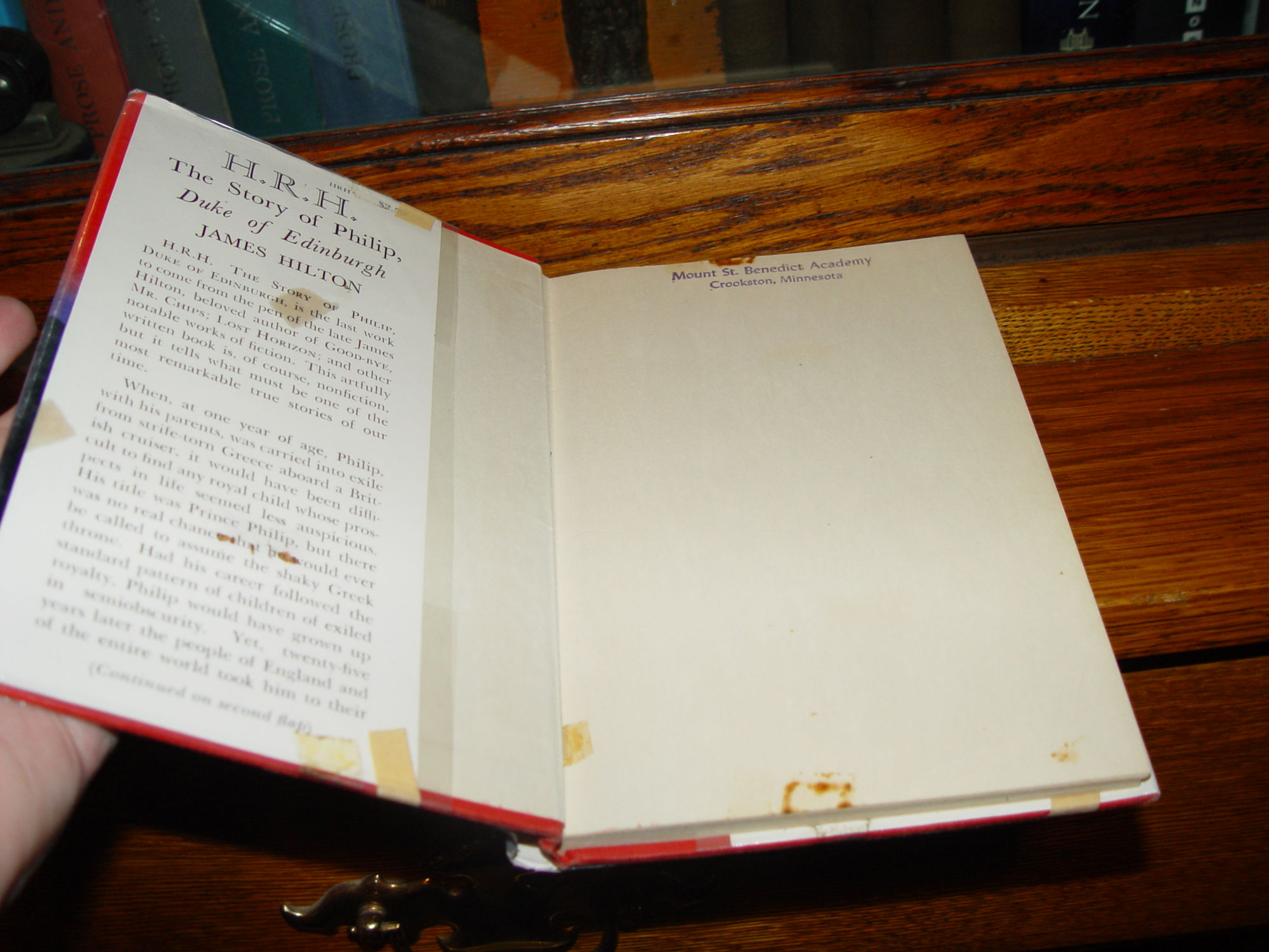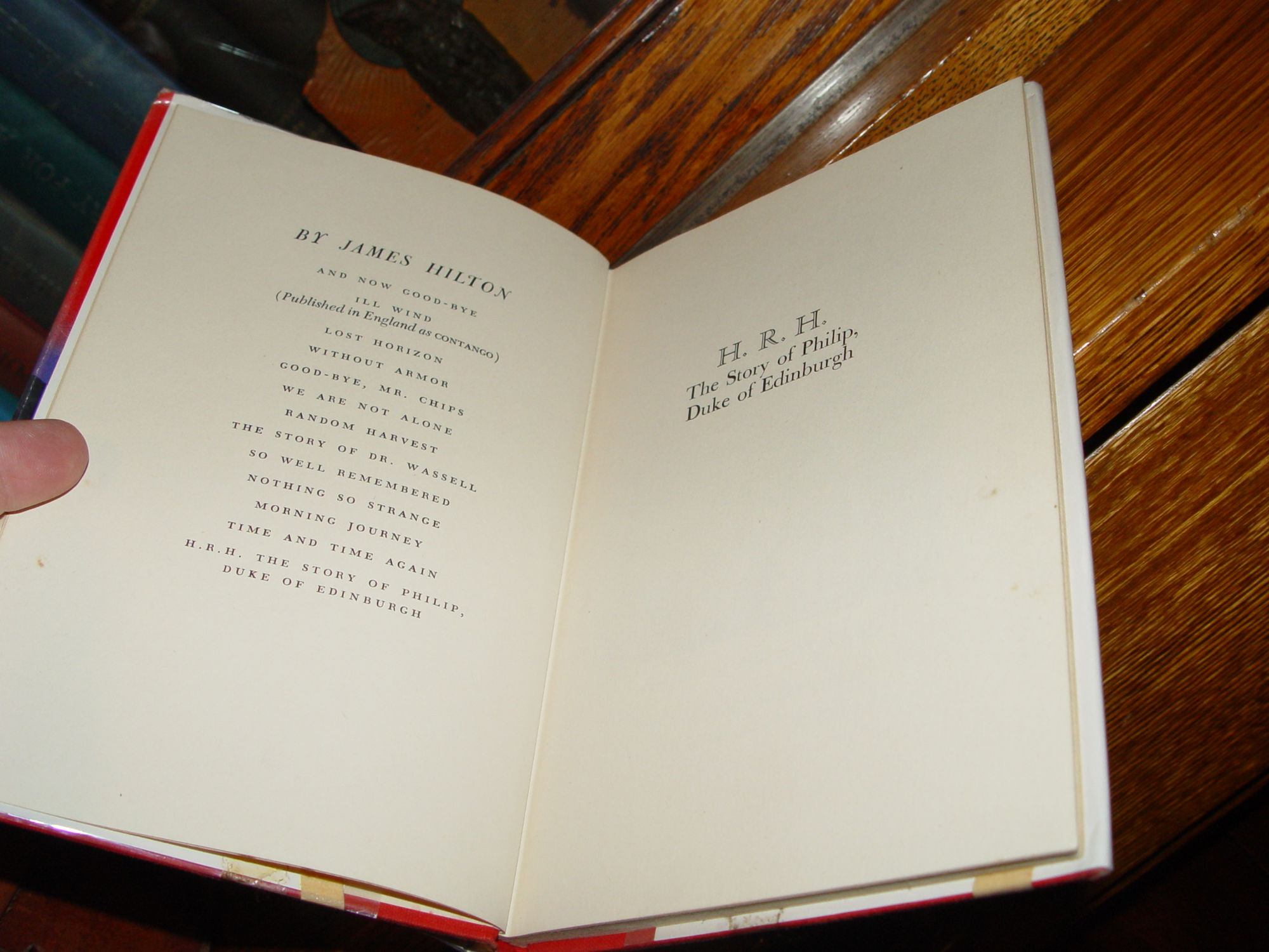 Published by Boston: Little, Brown, 1956 First American Edition - Stated Approx. size: 7.75" - 5" -- 73 pages In the fall of 1954, famed author and Oscar-winning screenwriter James Hilton ("Lost Horizon" "Goodbye, Mr. Chips") ("Mrs. Miniver") was asked by the Hearst Syndicate to provide a Sunday newspaper piece on "England's uncrowned king" Prince Philip who was then only little known to the British public despite being the husband of newly crowned Queen Elizabeth II. The Story of Philip, Duke of Edinburgh was published in book form by Little, Brown (Boston, 1956) and shortly thereafter by Frederick Muller Ltd. (London, 1956). Tells a special sort of success story complete with the outstanding elements of a continent shattered by force. For the small boy who left Greece, his birthplace, as an exile, spent his early childhood in Paris, his later boyhood under the adoptive and affectionate glance of his uncle Louis Mountbatten, studied in a German school that moved to Scotland with the Nazi crush, and bore Danish blood in his veins. His school-master Hahn felt he needed a great service to reveal and develop fully the talent for leadership Philip early indicated -- his Navy career fulfilled the commission. This career was changed by the equally demanding, one as Elizabeth's husband. James Hilton's appraising glance falls gently on the Duke of Edinburgh Illustrated with charming old photographs. Bright colorful cover kept safe years ago by a plastic covering. Note the old tape marks when it was applied. There are some old stampings of the previous owner, Mount St. Benedict Academy in Crookston Minnesota. Interior clean and unmarked. Wonderful addition to any library. Please see and enlarge photos and email with any questions prior to purchase. Thanks |