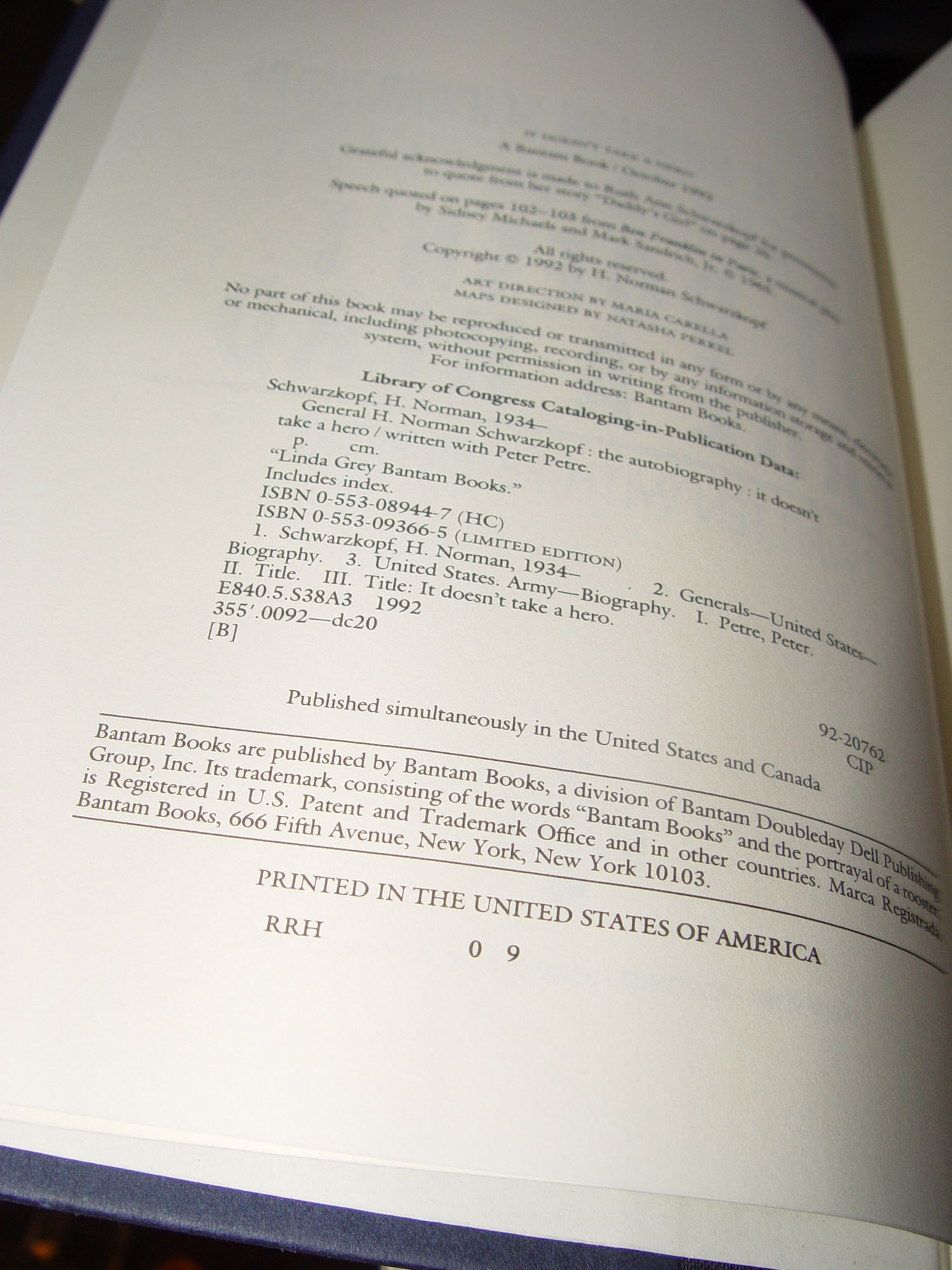 | Publisher: Bantam 1992 First edition ISBN 10: 0553089447 ISBN 13: 9780553089448 530 pages -- Approx. size: 9.5" by 6.25 by 1.5" by Norman Schwarzkopf, Peter Petre He set his star by a simple motto: duty, honor, country. Only rarely does history grant a single individual the ability, personal charisma, moral force, and intelligence to command the respect, admiration, and affection of an entire nation. But such a man is General H. Norman Schwarzkopf, commander of the Allied Forces in the Gulf War. Now, in this refreshingly candid and typically outspoken autobiography, General Schwarzkopf reviews his remarkable life and career: the events, the adventures, and the emotions that molded the character and shaped the beliefs of this uniquely distinguished American leader. Book is in wonderful condition with great black and white photographs in two sections of book. Dust jacket in very good condition as well with only a few minor handling or shelf wear mentions. Please see and enlarge photos and email with any questions prior to purchase. Thanks |