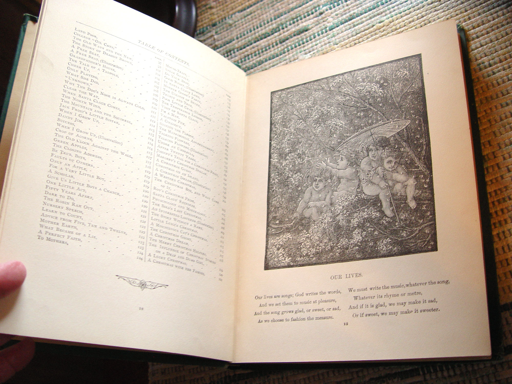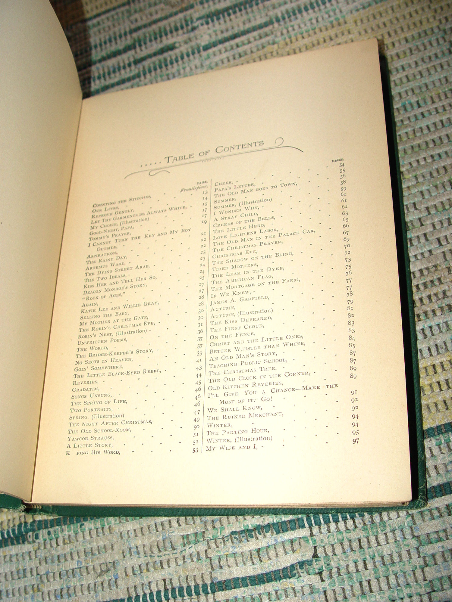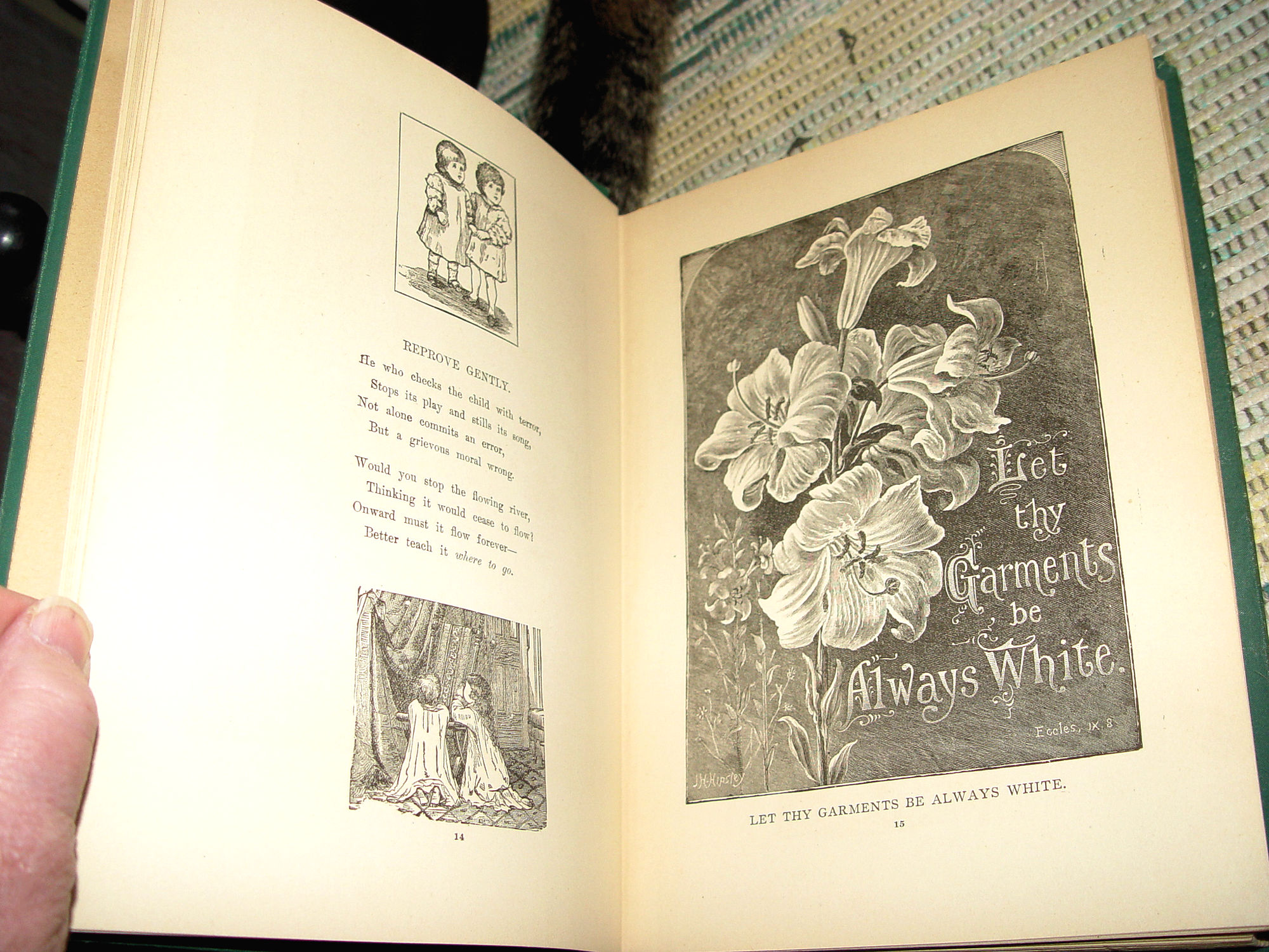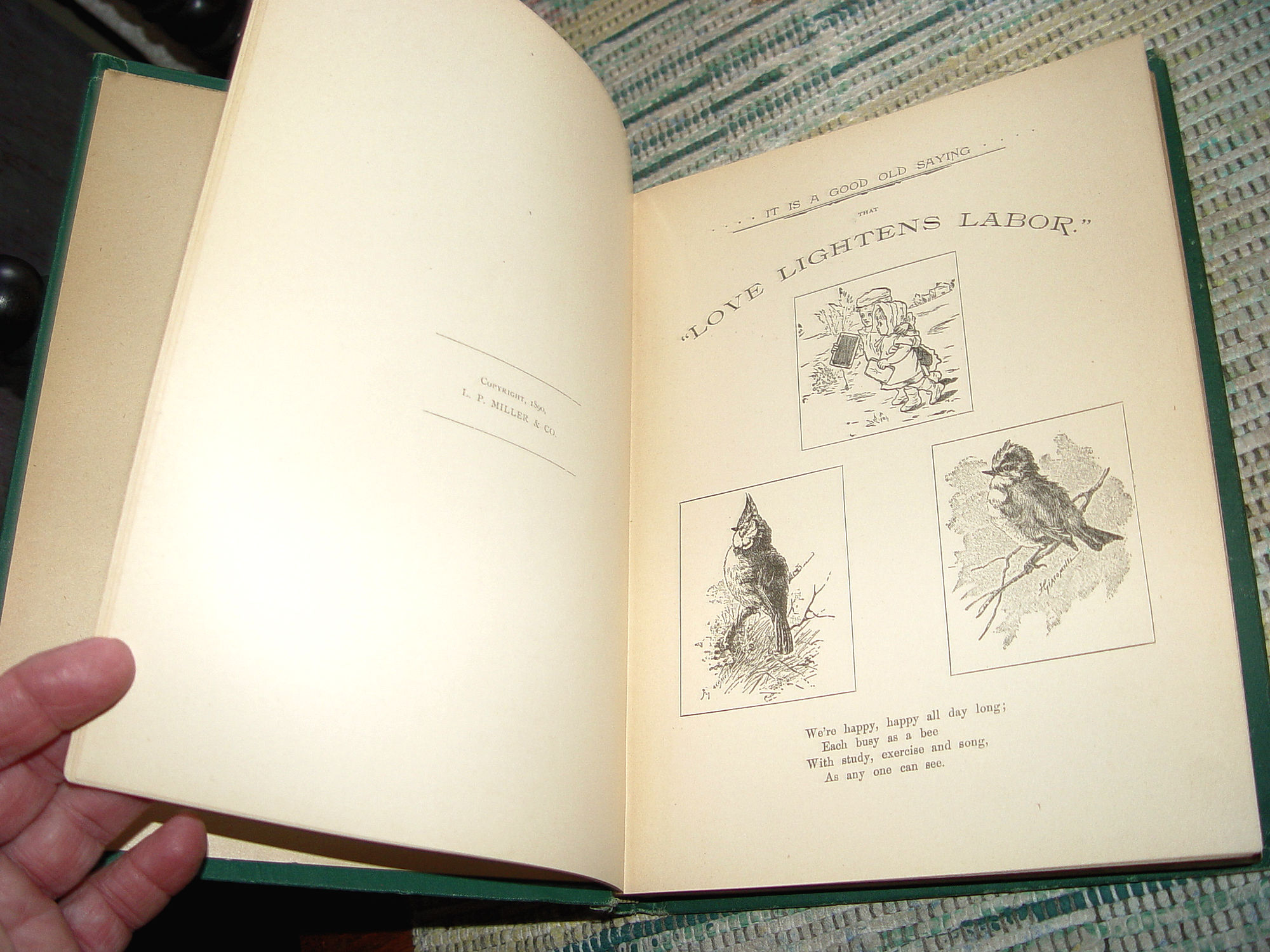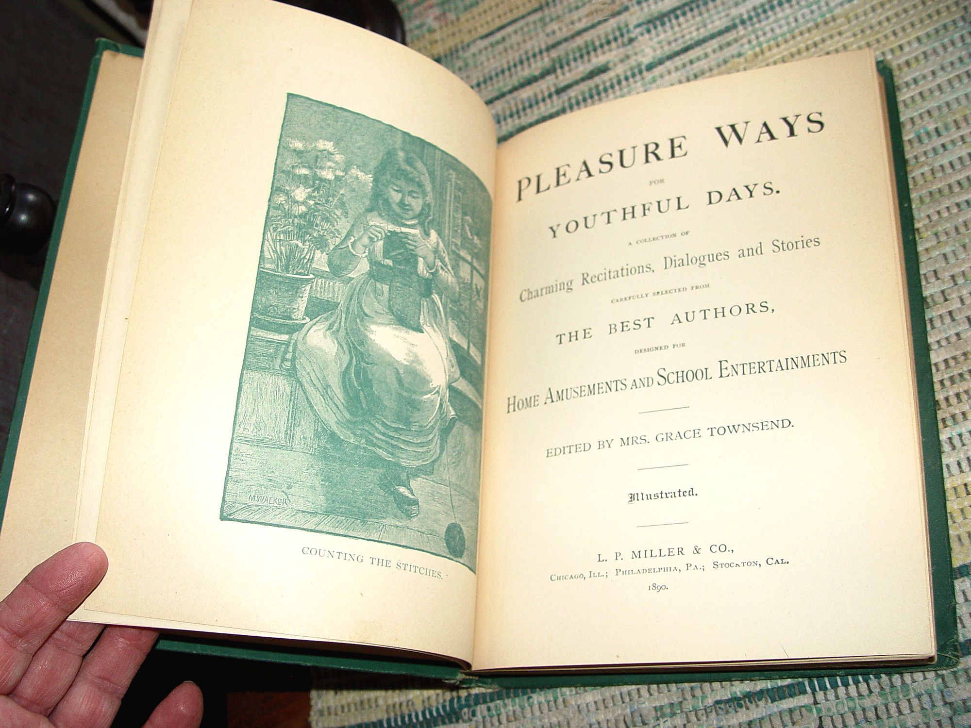 PPublished by L. P. Miller & Co., Chicago, 1890 First Edition 223 pages; Approx size: measures 8" - 9" tall Hardcover; Vintage Children's Book Pleasure Ways for Youthful Days A Collection of Charming Recitations, Dialogues and Stories Carefully Selected from the Best Authors, Designed for Home Amusements and School Entertainments Fabulous black and white illustrations. It is full of poems and graphics that are great for any library or the perfect gift for the book lover in your life. Wonderful piece of Victorian literary history. Green cloth covers with gold gilt decorated front. This shows some corner, edge and spine end wear although I believe this is very good for it's age. Tight and intact. Please see photos, enlarge and email with any questions. Thanks for looking. |