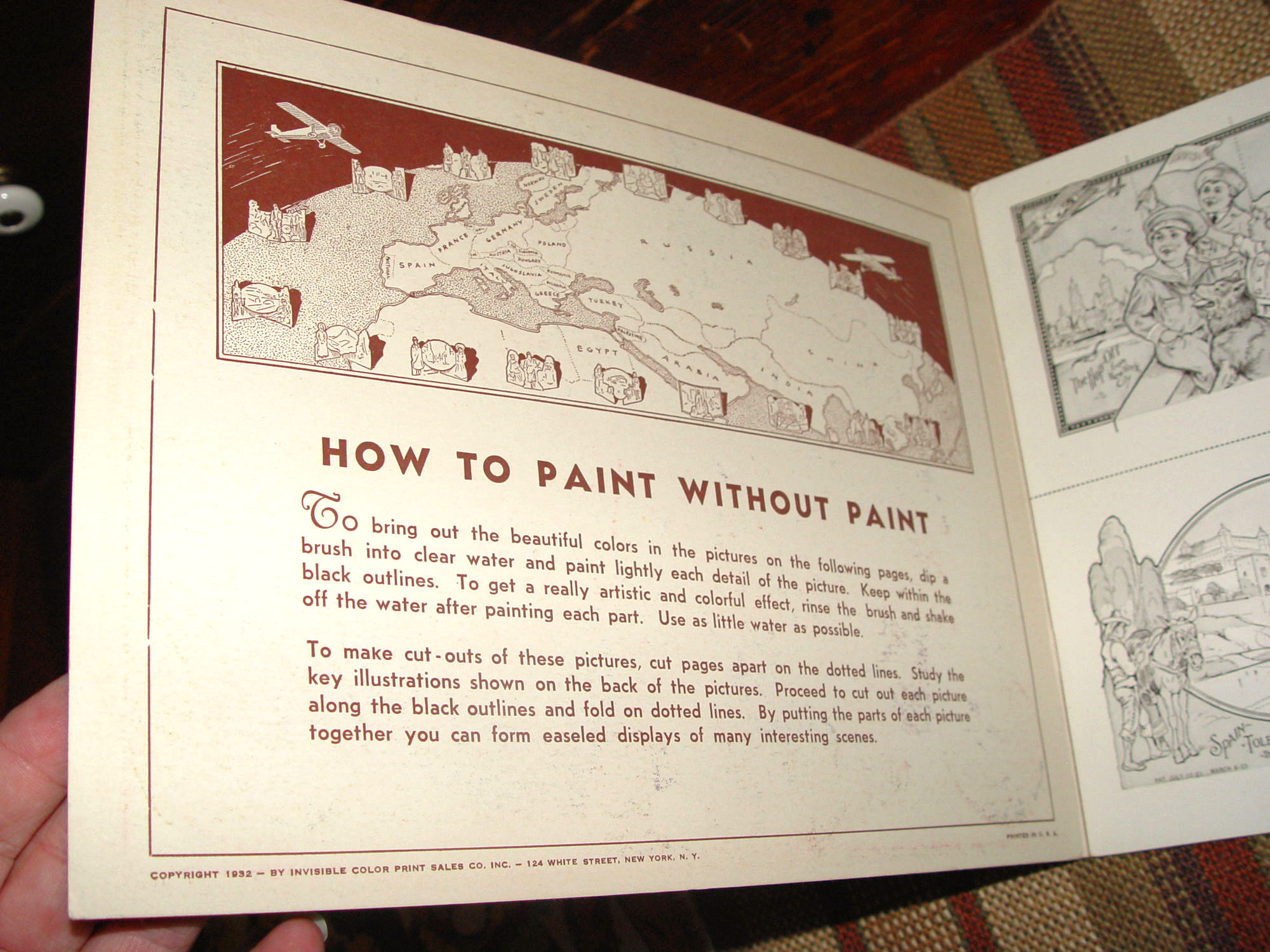 Simply dip a paint brush into water, brush it over the black and white patterns (stay in the lines!) and you’ll be amazed at the colors that magically appear. The dynamic black and white illustrations are already stunning but with water they come alive. Illustrated with charming old fashioned pictures that let children of an earlier era travel to the world. Excellent condition for this book has never been used. Perfect for display or reading, gift or collecting.