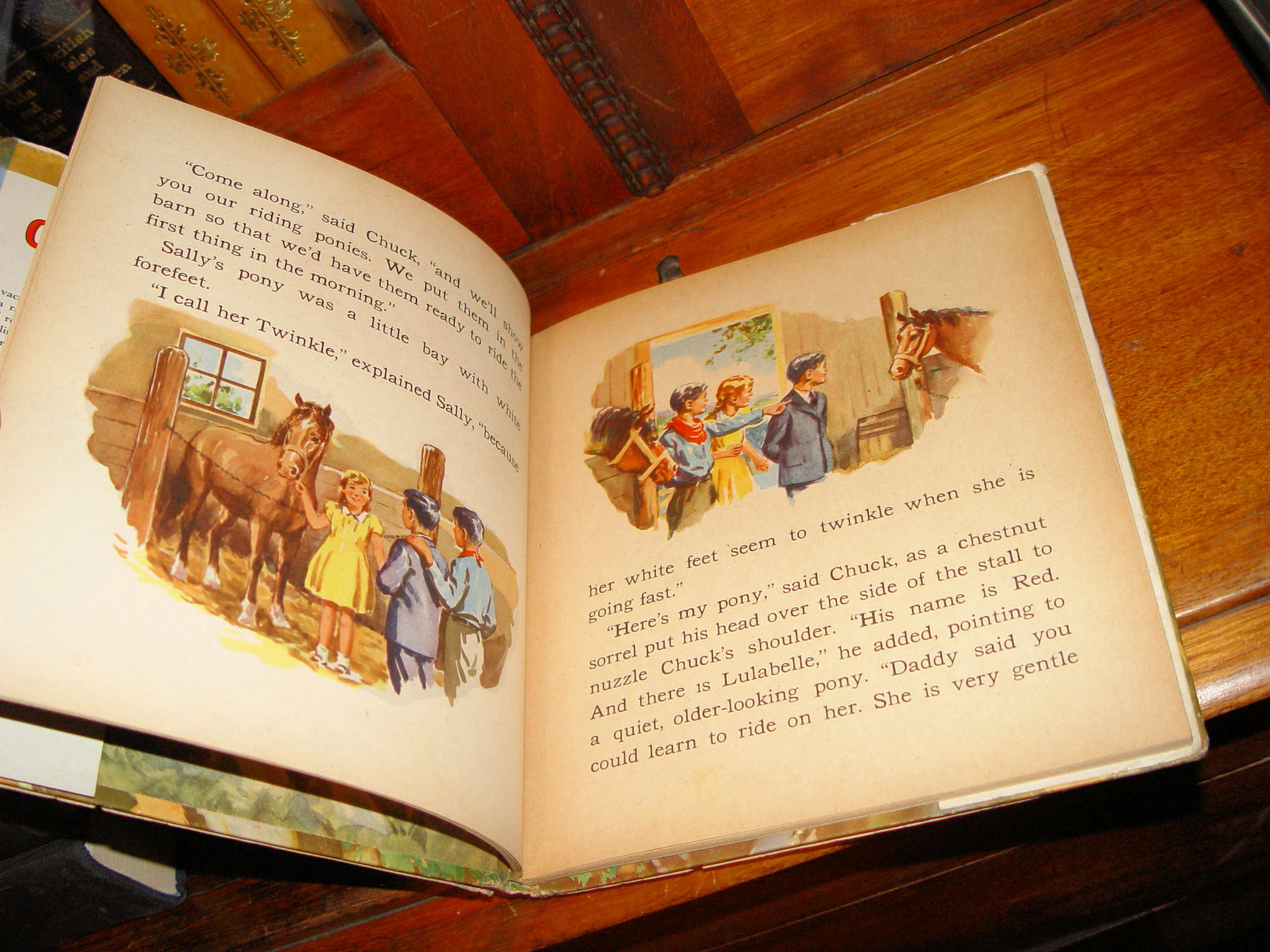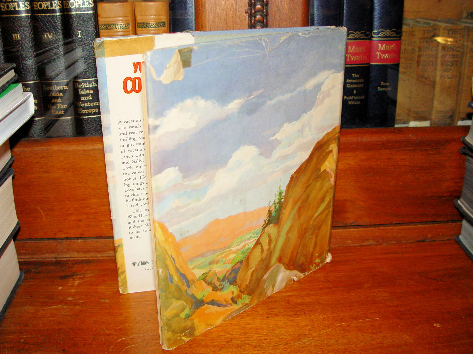 Publisher: Whitman Publishing, Racine, Wisconsin, 1947 Frances E. Wood Illustrated by Robert Weisman Unpaginated -- Approx. size: 8.5" by 7.75" A great 1940s wild wild West for a young child. Fabulous bright illustrations throughout. A vacation on a Western ranch -- a ranch with lots of horses and real cowboys! What more thrilling vacation could a boy or girl want? That is the kind of vacation David has on the ranch with his cousins, Chuck and Sally. .... But best of all he finds out the secret of being a real cowboy. Via front flap. Book itself is in beautiful condition, the dust jacket shows tears and wear but nice it's still here. (See photos) Only very slight bumped corners and slight toned pages. Unmarked. Bright colors and interior. Please see and enlarge photos and email with any questions prior to purchase. Thanks |