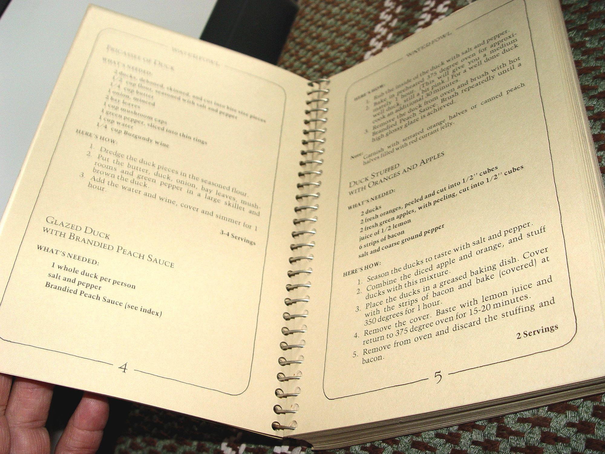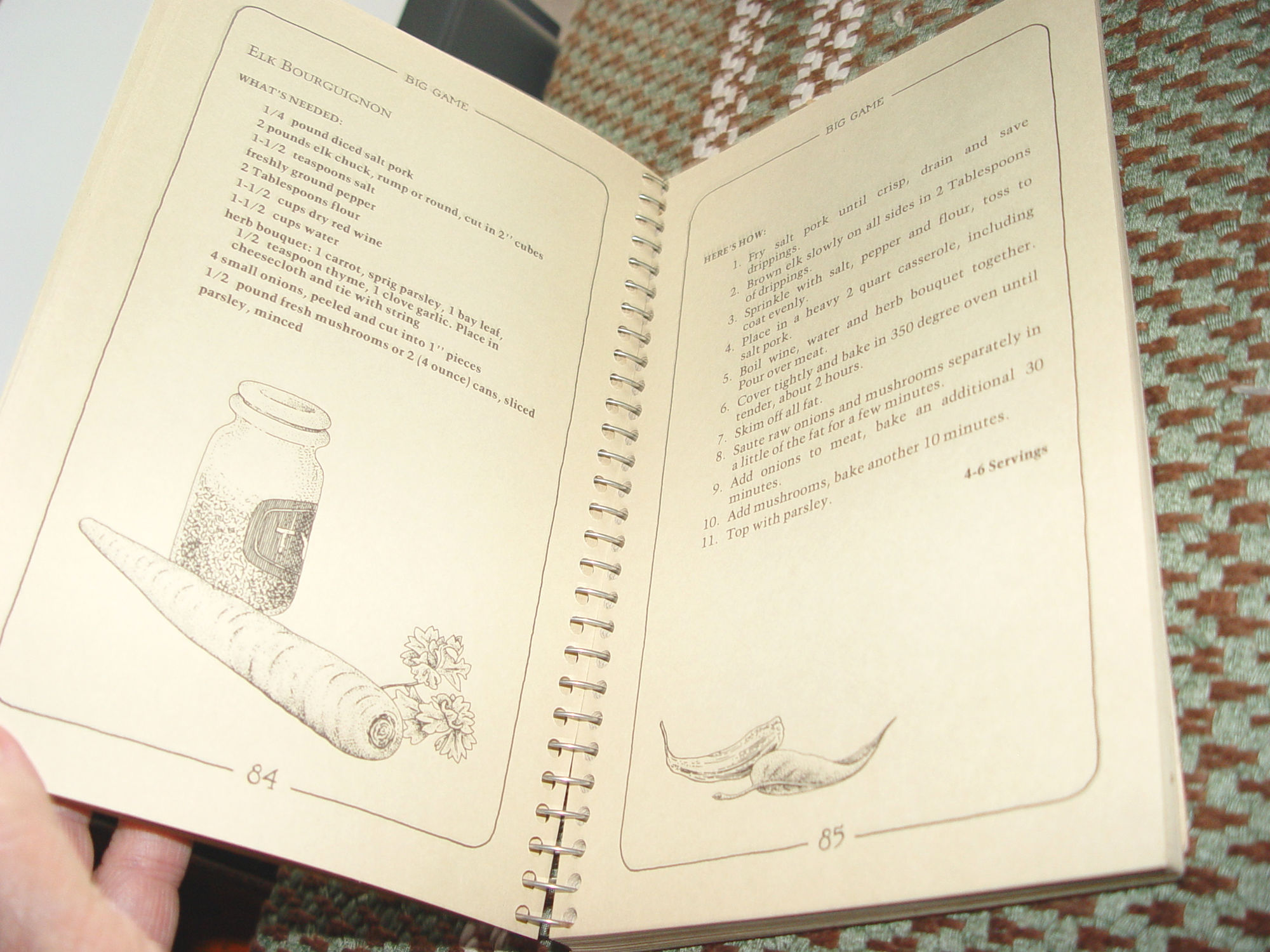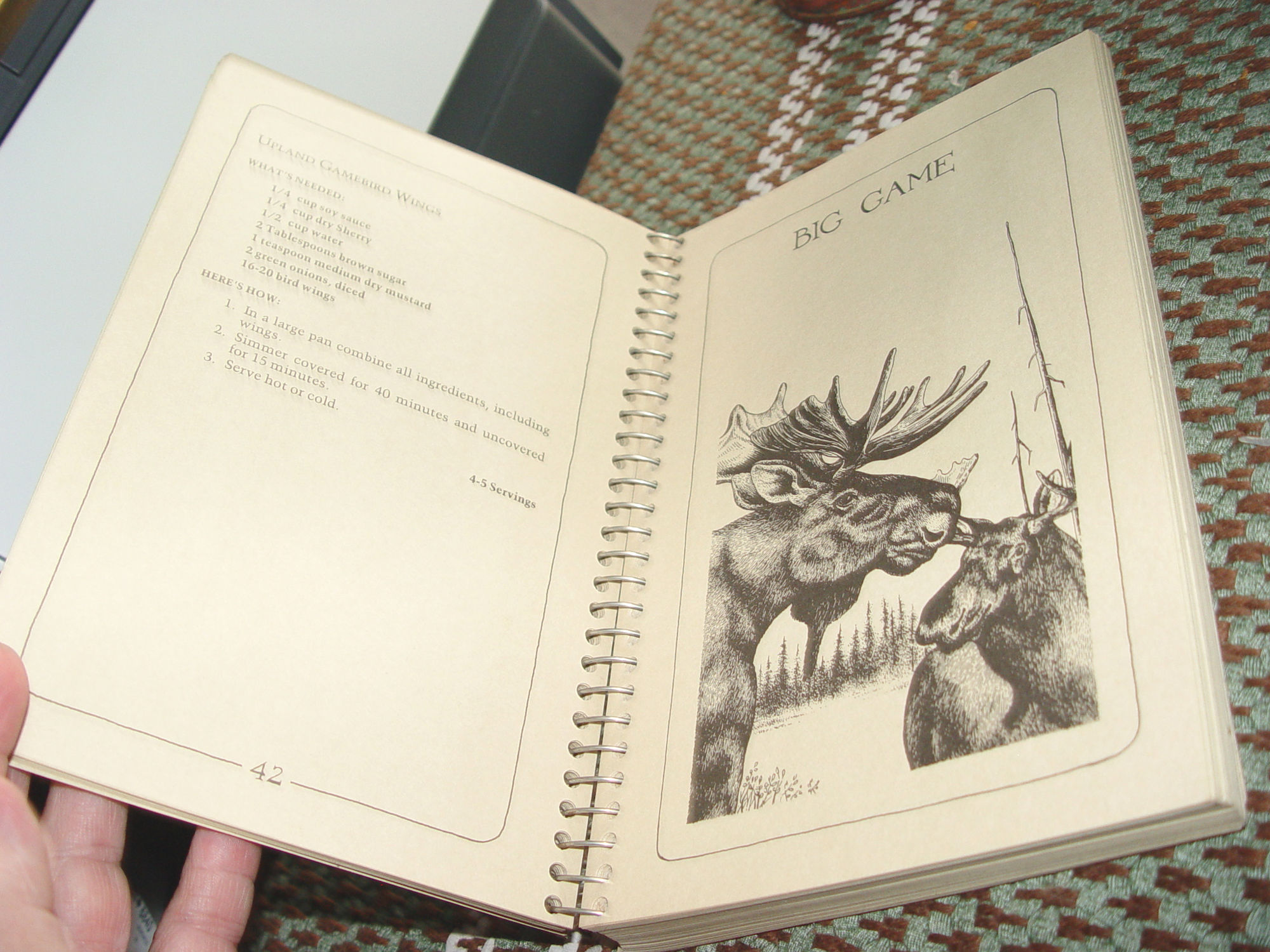 Publisher: Waldman House Press 1980 First Edition 253 pages plus index and menu -- Approx. size: 8.75" by 6.5" by 1" This book focuses on recipes for wild game (big and small), fish, birds and more. Begins with information regarding the author and how the cookbook came to be. This is a first edition copy signed and gifted by the author. A really neat spiral-bound soft cover that has fabulous illustrations and recipes. There is a section for exotic animals such as lion, tiger, camel, eland, elephant and ostrich. :( Very good condition with some very minor handling wear to covers. Interior spotless. Please enlarge all photos and feel free to email with any questions. Thanks for visiting. |