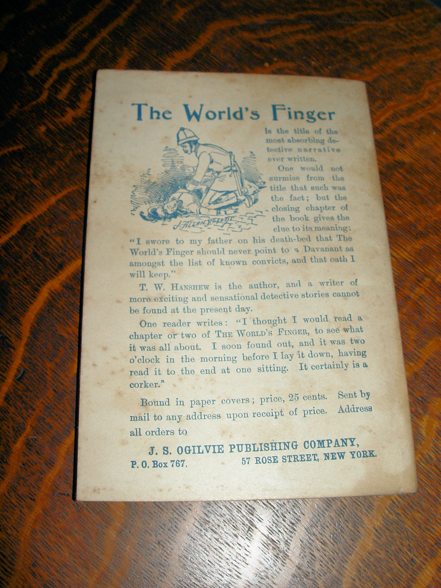 | New York The Parlor Car Publishing Co. 1898 First Edition. 78 pages A Tale to Read by Old Sleuth 10c Side stapled paper soft covers This scarce dime novel is tightly bound. In very good condition. Toned due to age. A sharp crease upper right corner of cover. Hard to find the originals. See others I have to offer and thanks for viewing! Please see photos, enlarge and feel free to email with any questions. |