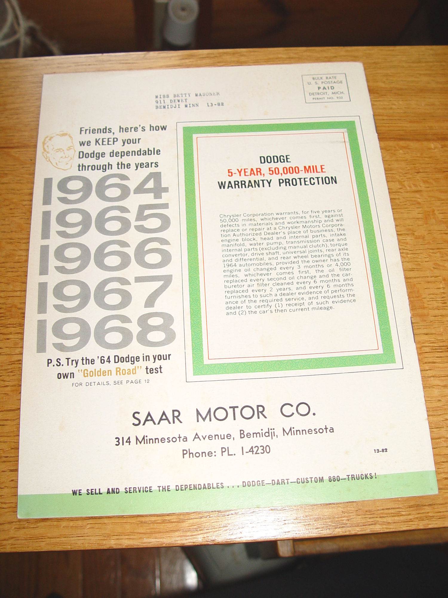 Publisher: Dell Publishing 1964 23 pages -- Approx. size: 8.5" by 11" 50 Years of Dependability - DODGE 1914-1964 Original complete magazine. 1964 Dodge News Magazine, volume 29, number 1 Golden Jubilee Souvenir Issue. Read about advancements in automobiles from 1914 to 1964. Color center page features the new 1964 Dodge Dart, Dodge and Dodge 880. Great early photographs of 1914 assembly line and more. Back cover printed with Saar Motor Co., dealership in Bemidji, MN. Subscription address stamp upper back cover. Very nice condition with only slightly bumped corners. A few minor creases to covers. Slightly toned due to age but spotless interior. Please see photos, enlarge and email with any questions. Thanks for looking. |