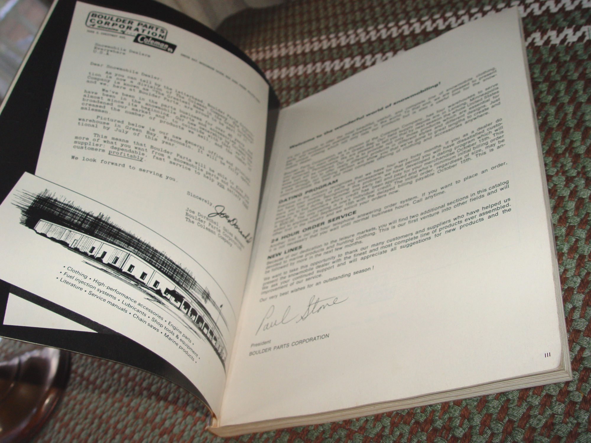 Publisher: Boulder Parts Corporation 1971 18 pages -- Approx. size: 11" by 8.5" by .5" Usefull and complete line of snowmobile clothing, parts, and accessories. Boulder Parts Corporation was a division of the Coleman Co. * Clothing, High-performance accessories, Engine parts. * Fuel injection systems, Lubricants, Shop tools & equipment. * Literature, Service manuals, Chain saws, Marine products. Very good used condition with very minor handling wear. Slightly bumped corners and some minor soiling or rubbing showing on back cover. Clean with no writings. All order sheets intact. Please see photos, enlarge and email with any questions. Thanks for looking. |