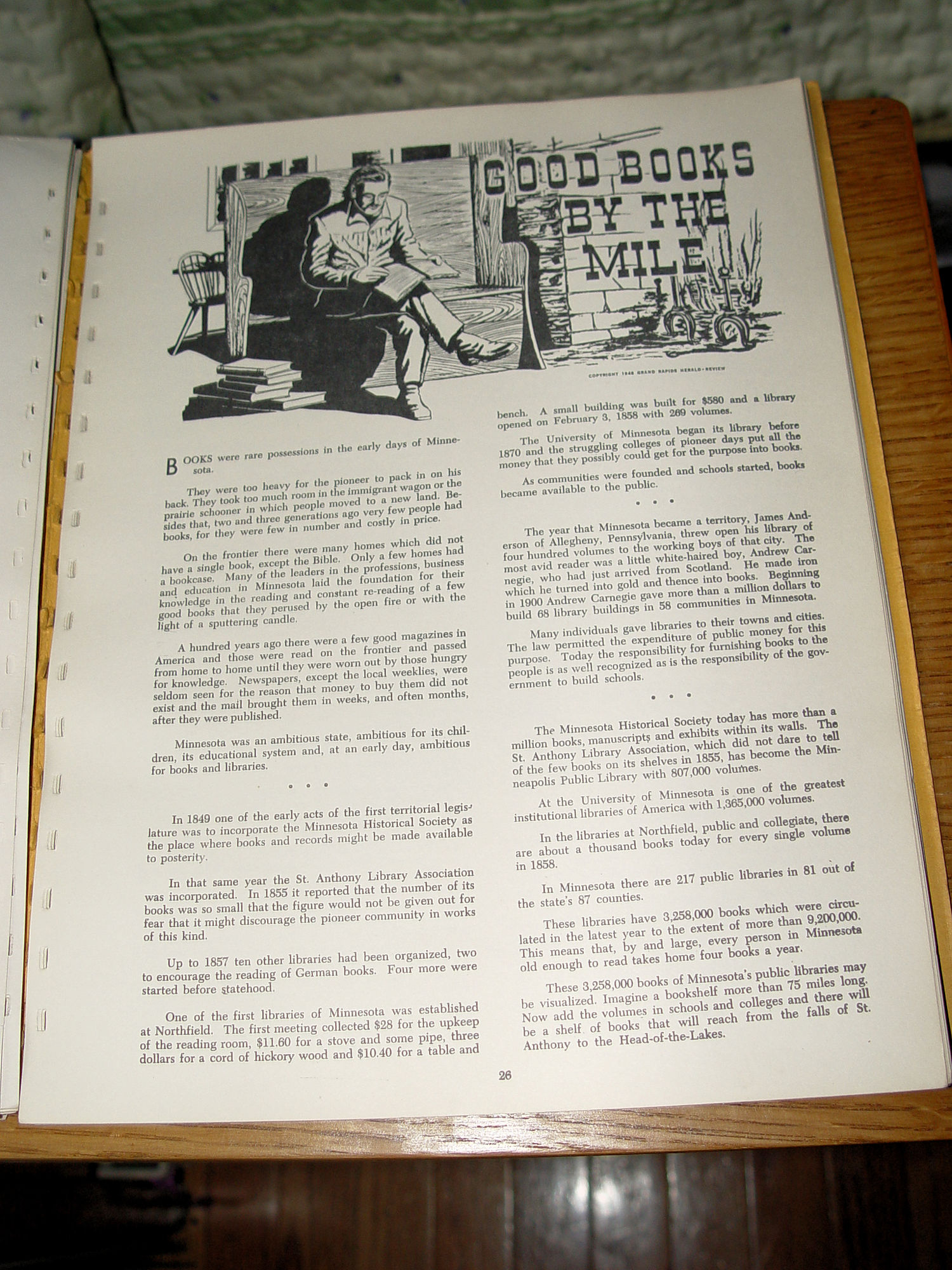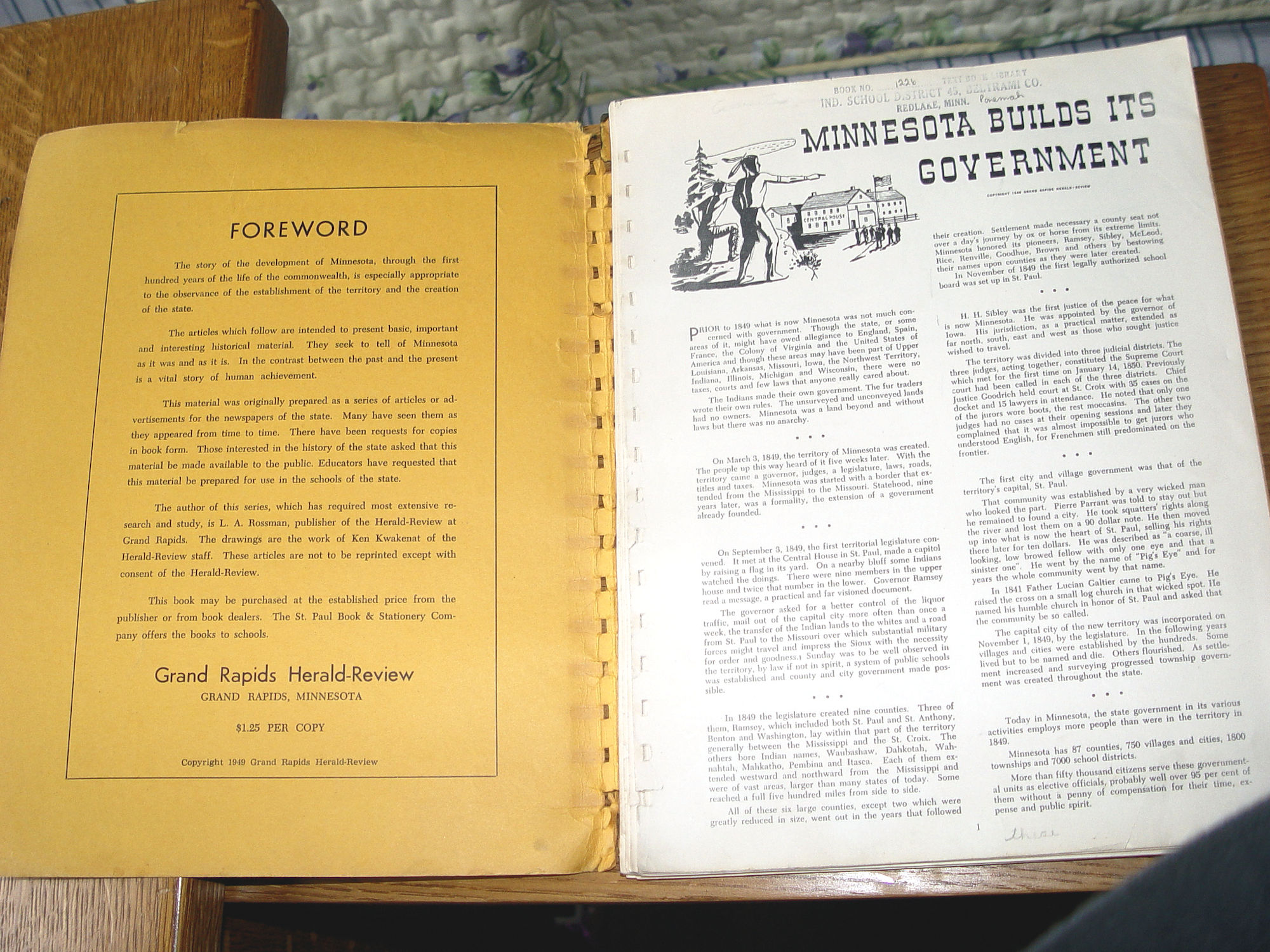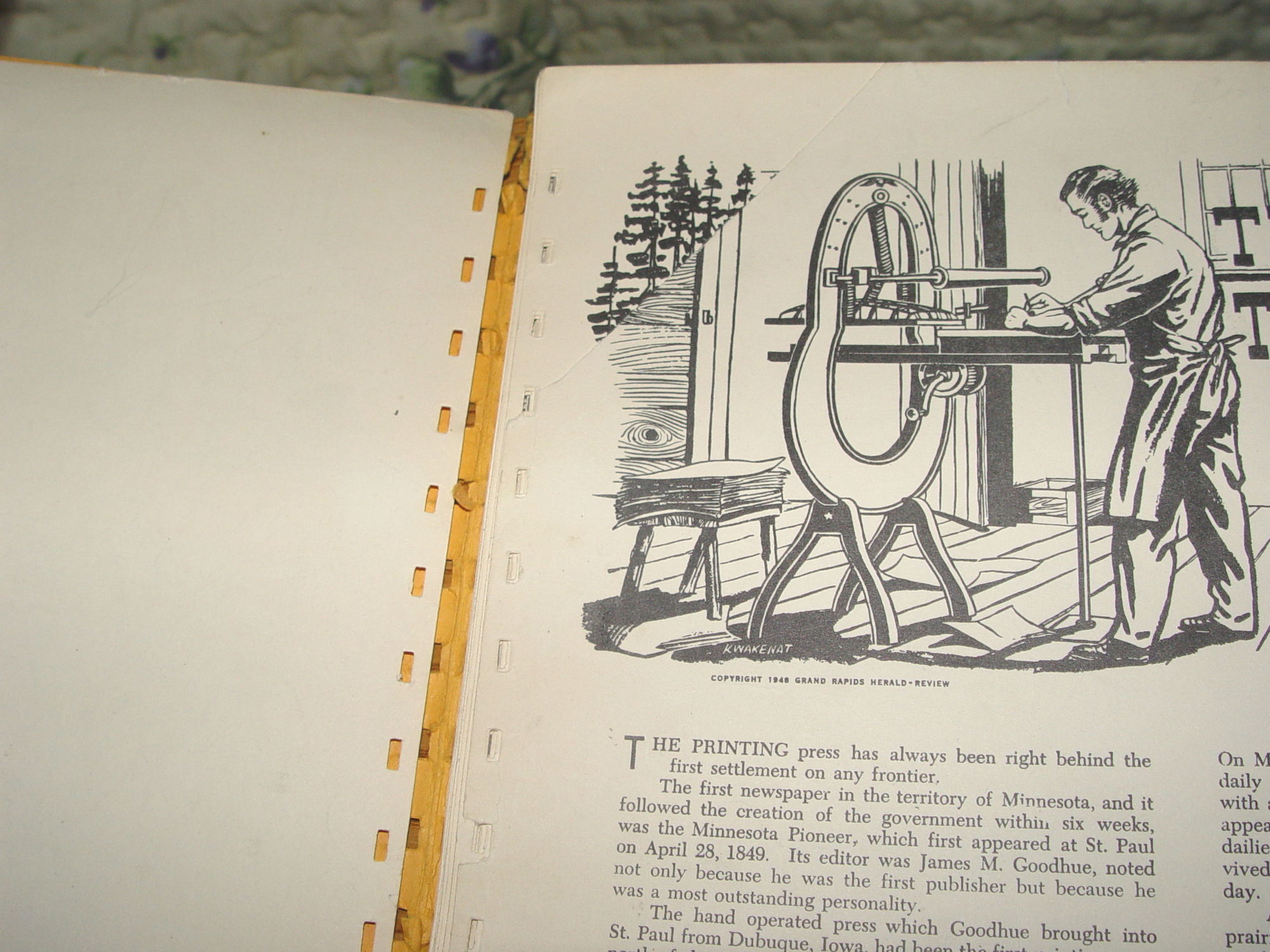 Publisher: Grand Rapidc Herald-Review 1949 36 pages -- approx. size: 12 by 9.24 inches Early (Stories of Progress) in Minnesota History Scarce find. The story of the development of Minnesota, through the first hundered years fo the life of the commonwealth. Seeking to tell of Minnesota as it was and as it is as of 1949. The author is L.A. Rossman, publisher of the Herald-Review at Grand Rapids, MN. 36 pages, all one-sided with great graphics by Ken Kwakenat.and easy to read dialog. This was taken from original newspaper articles over time and throughout the state. Very good condition other than the plastic spine is missing, book is intact though. Slightly bumped corners and minor edgewear. Some soft soiling to covers. Pages are clean and bright. Please see photos, enlarge and email with any questions. Thanks for looking. |