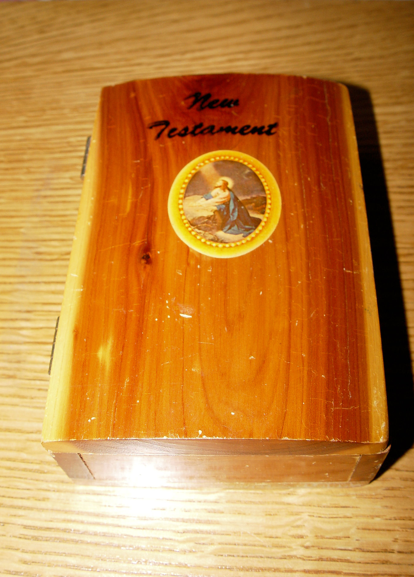 Vintage Wooden Cedar The Gideons New Testament Box and Bible |