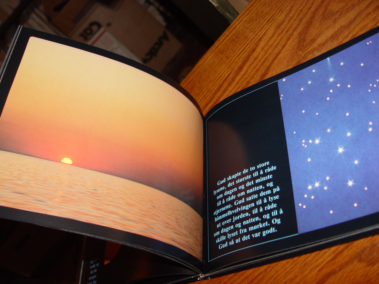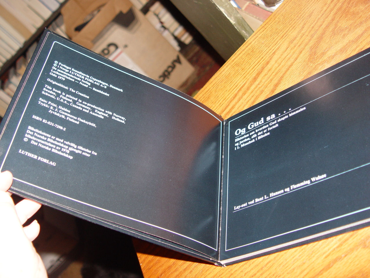 Og Gud sa; historien om hvordan Gud skapte himmelen og jorden, slik det ble fortalt i 1. Mosebok i Bibelen English translation -- And God said; The story of how God created the heavens and the earth, as it was told in Genesis in the Bible Publisher: Luther 1979 Oslo Layout by Bent L. Hansen and Flemming Walsoe Number of pages: 67 -- 9.75" by 8" Author: Enoch Enough Original Title: The Creation Denne boken er tilegnet menneskene på jorden som er en del av Guds Skaperverk -- This book is dedicated to the people on earth who are part of God's Creation Thank heavens for Google Translate. Lovely hardcover book in black with outstanding photographs. Wonderful condition. Slightly bumped upper spine and corners. Would make a perfect gift or addition to your home library. Please see photos, enlarge and email with any questions prior to purchase. Thanks for looking. |