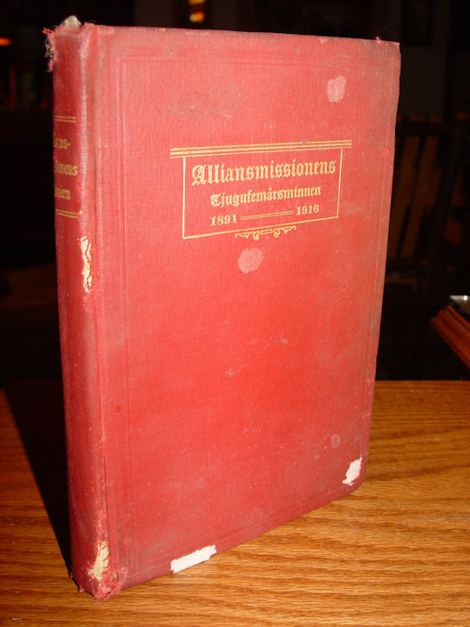 Publisher: Chicago, Ill. : Skandinaviska alliansmissionen, 1916 ; Swedish 448 pages -- Approx size 8.75" by 6" Scandinavian Alliance Mission of North America; Missionary service in foreign lands. Scandinavian Alliance Mission in China. Scarce book. The Maiden Association in Asker was founded in 1865 20 kilometers southwest of Örebro in the county of Närke. A group of unmarried women closely connected to the Asker Baptist congregation met for prayer, bible reading and conversations with early democratic overtones. They gathered in a time of change in a variety of areas, both social as well as church-related. The surviving material from these women – in the form of protocols, membership registers, etc. – provides an insight into their reflexive process. The local Maiden Association in Asker becomes a window, a vantage point into something that would otherwise be hard to access: in other words, the situation and thinking of "ordinary" women. Good antique condition. Red cloth hard cover with spine exterior showing some wear. Tears and rips at spine ends and one small spot on edge. Small staining to upper top toward spine on the inside to page 15. Otherwise the interior is clean and unmarked. Complete and intact. Please see and enlarge photos and email with any questions prior to purchase. Thanks for looking. |