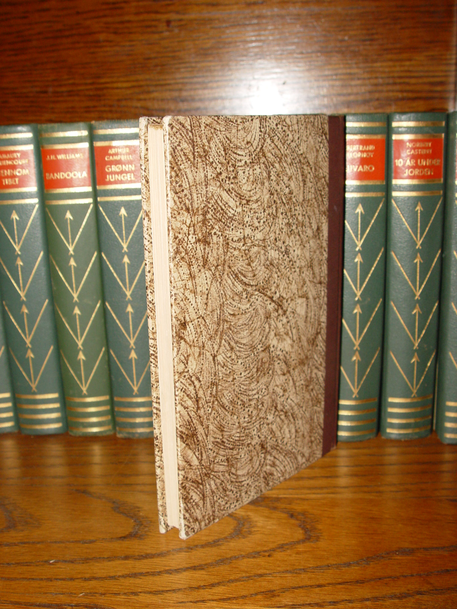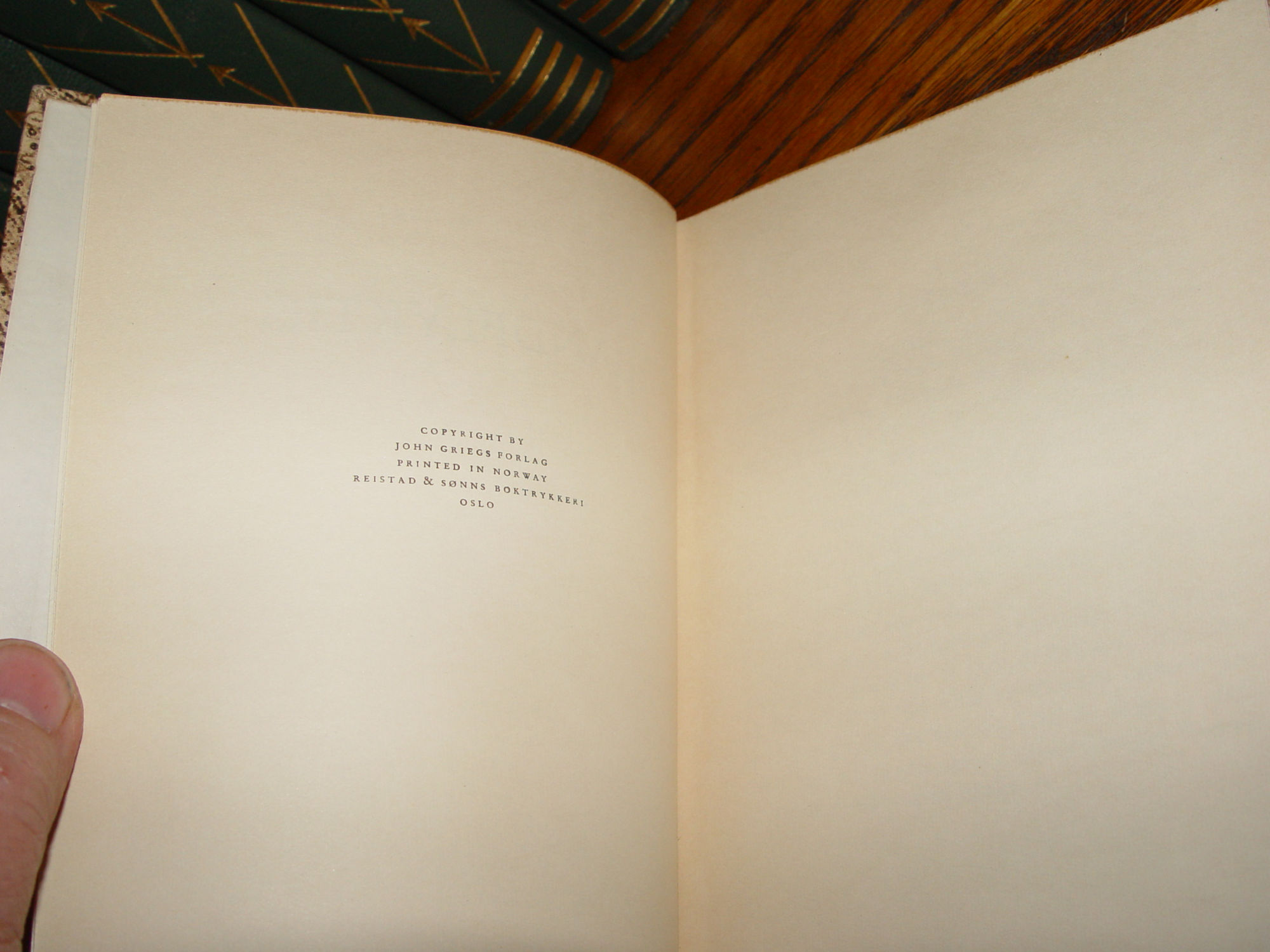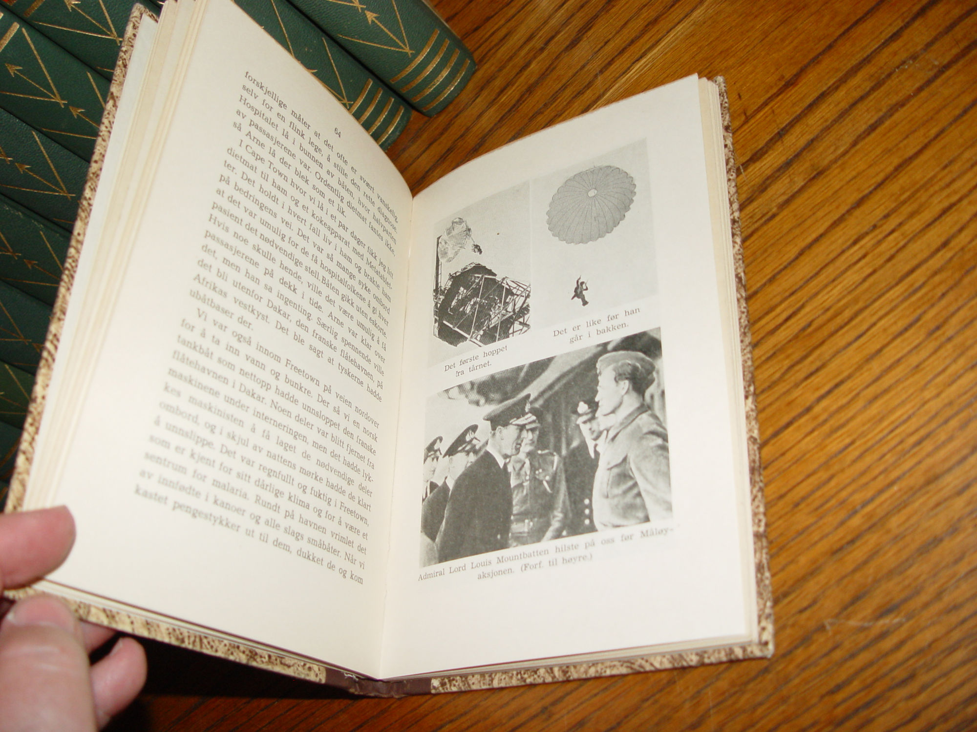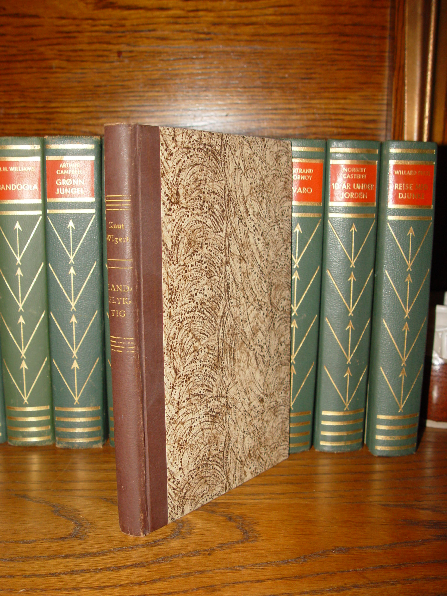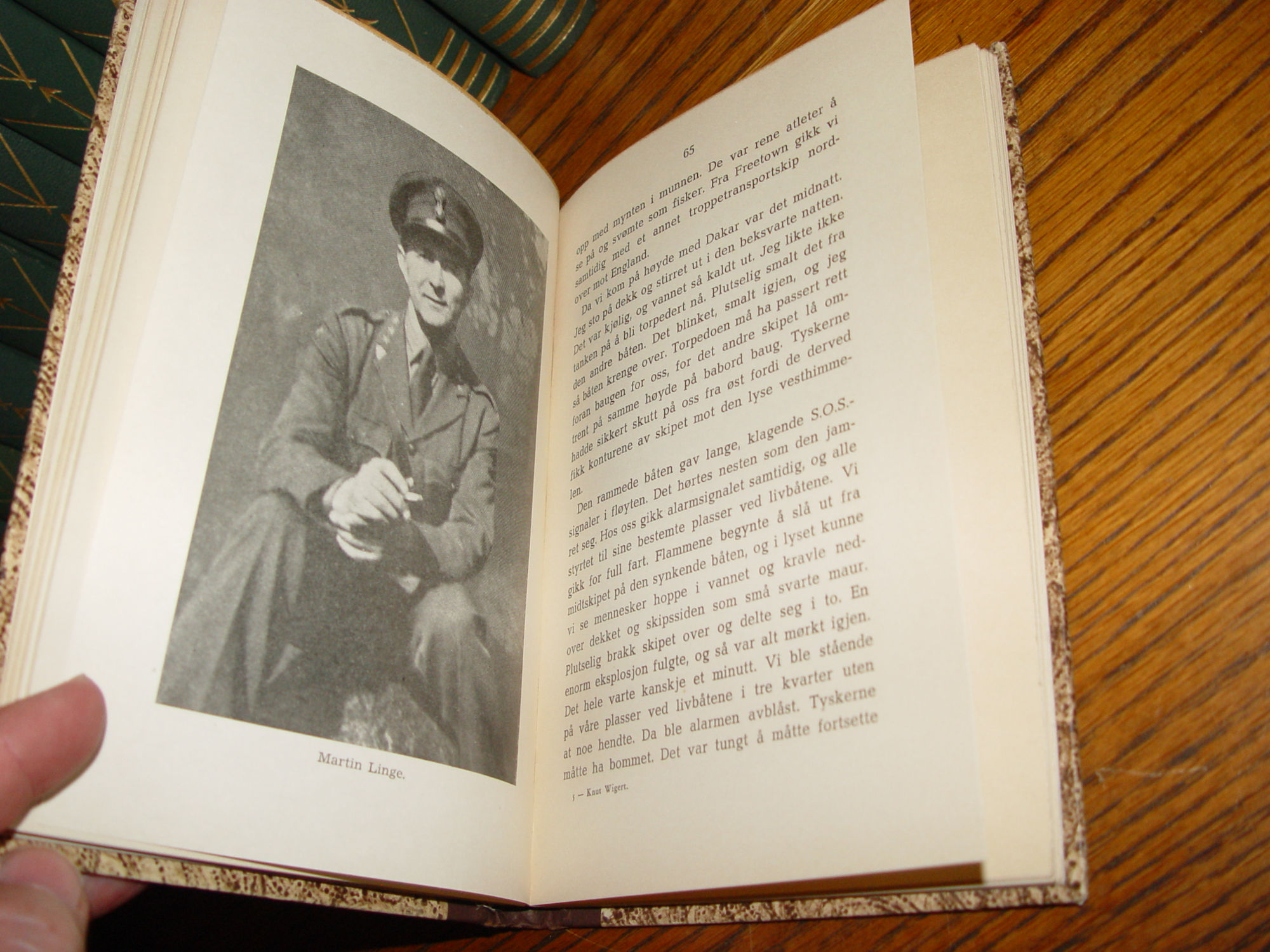 Publisher: John Grieg's publishing house; Oslo Norway 1945 126 pages; Approx size: 7.75 by 5.25" Language(s): Norwegian Illustrated with black and white photographs. Knut Kirsebom Wigert (3 October 1916 – 14 June 2006) was a Norwegian actor, known for his many Ibsen roles and the establishment of an Ibsen museum in Oslo. During the Second World War, Wigert was a member of the Norwegian Independent Company 1, recruited by former actor and leader of the group Martin Linge. He participated in the Operation Archery raid at Måløy in 'December 1941, and later graduated as a lieutenant from the Royal Military College, Sandhurst in 1943. He published the book Landflyktig in 1945, describing his travel via Stockholm, Moscow, Istanbul, Cairo and South Africa to England, and later service in the army. Very nice condition for the age. Decorated boards with browns and creams. Leather like spine with gold gilt lettering. Slightly bumped corners. Interior clear and clean. Please see and enlarge photos and email with any questions prior to purchase. Thanks for looking. |
