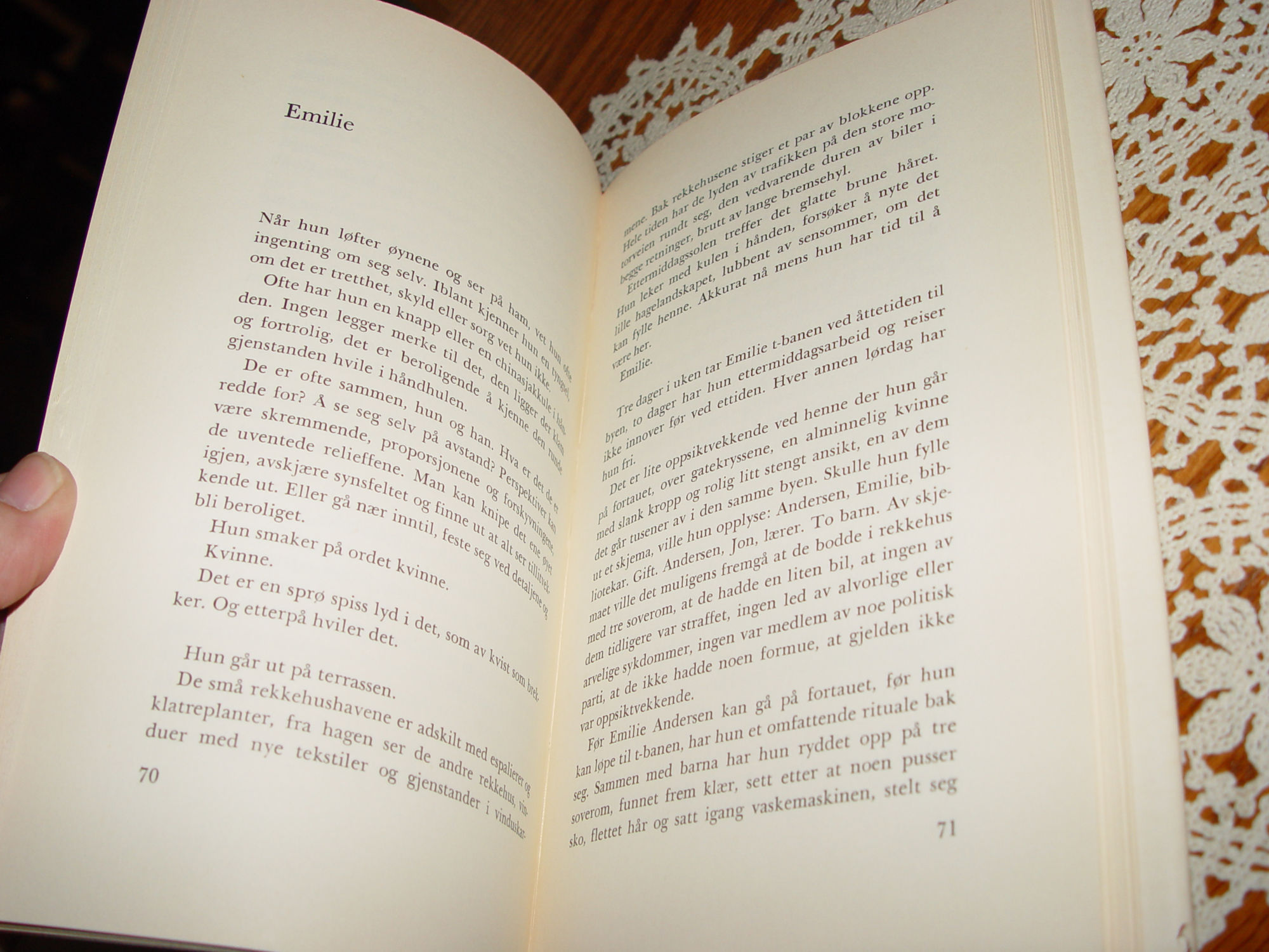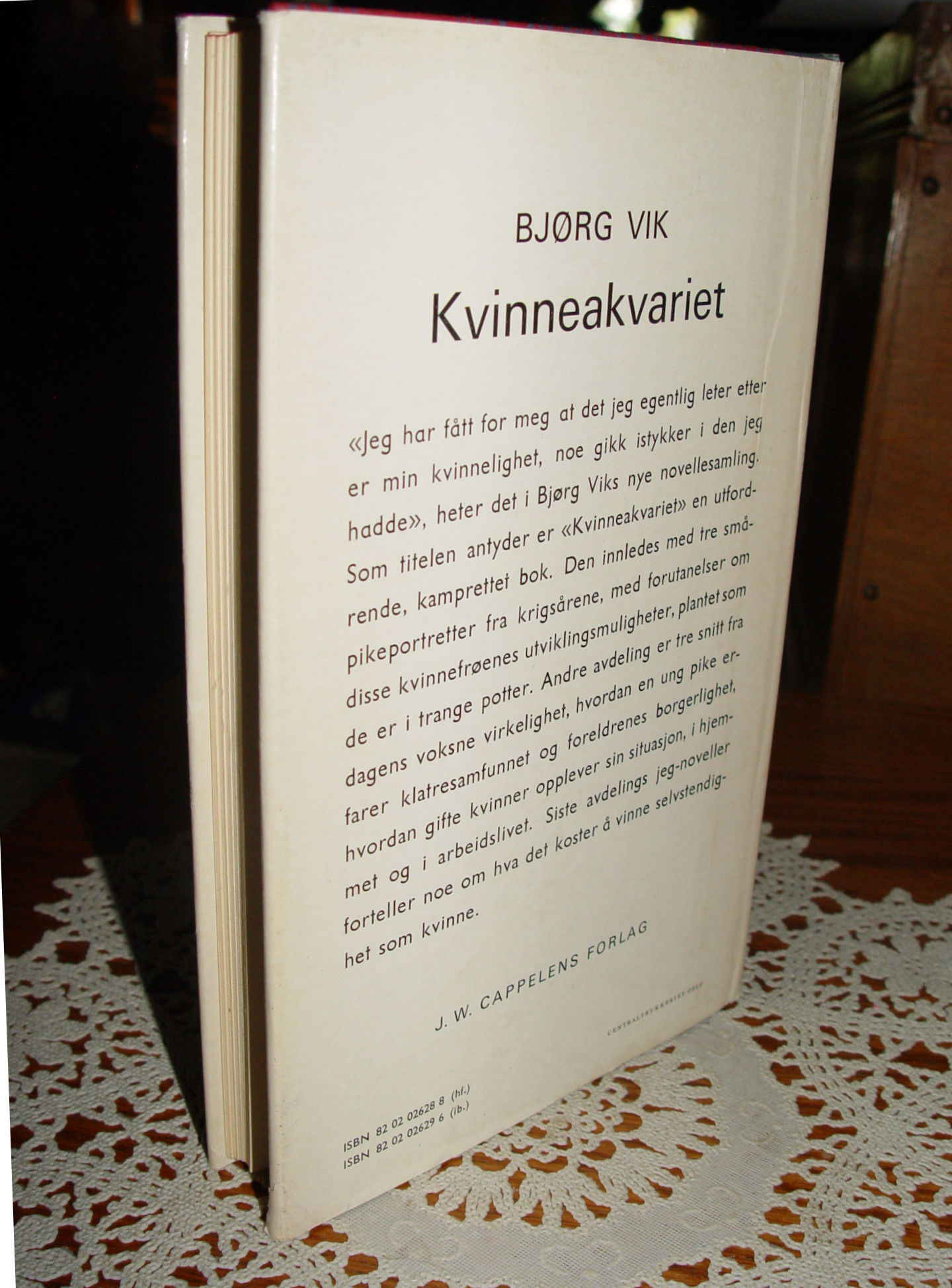 Published by Cappelen, 1972 ISBN 8202026288 | 8202026296 Norwegian Short stories, HC - 131 pages, approx. 8.5" by 5.5" Although Bjørg Vik has written plays, novels, and children's books, her reputation rests mainly on her eight short story collections, two of which have been translated into English. Vik is known as a feminist writer, and most of her stories deal with women at various stages in life. An Aquarium of Women (Kvinneakvariet) is Vik's most overtly feminist work. Each section of three stories represents a different stage in women's lives. The first story ("Sunday 43") features adolescent girls learning about adult life. Fabulous find and a great gift idea for your Norwegian friend or your cultured own library. Very good condition with spotless interior and very nice dust jacket. Jacket does show minor wear to edges and a few small tears. Book is beautiful with decorated boards. Please see photos, enlarge and email with any questions prior to purchase. Thanks for looking. |