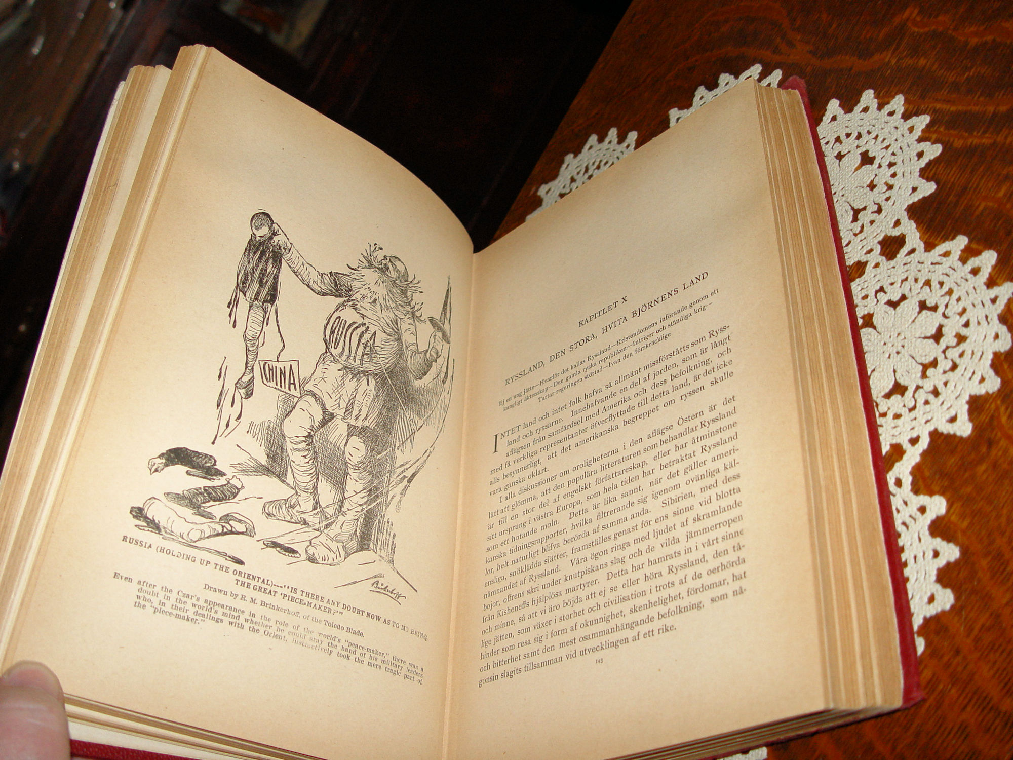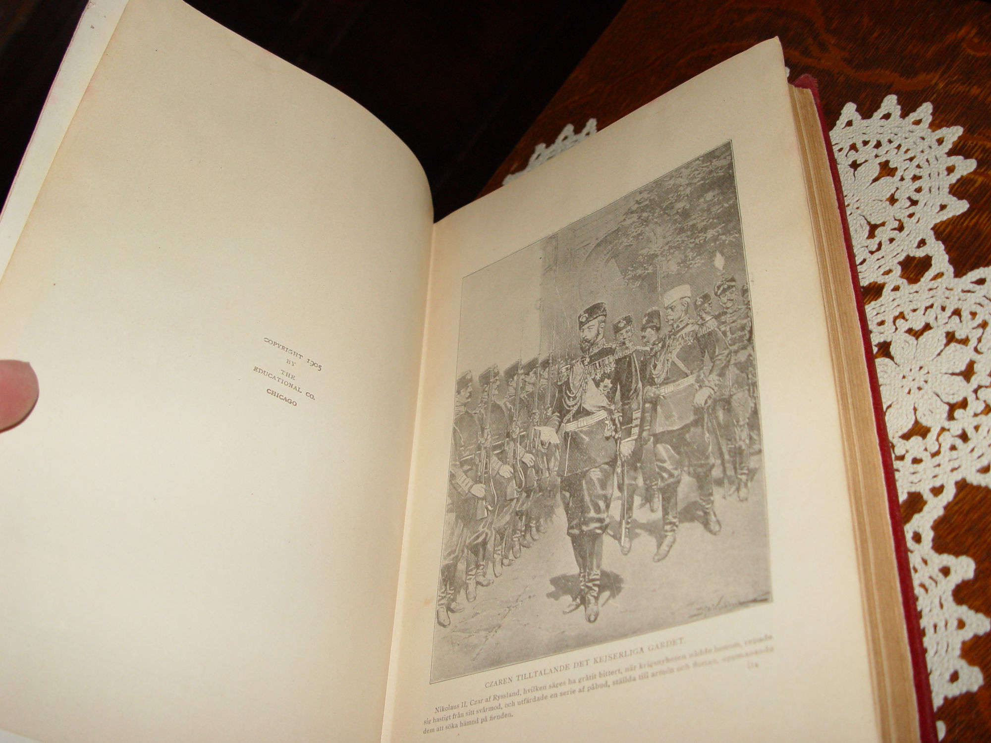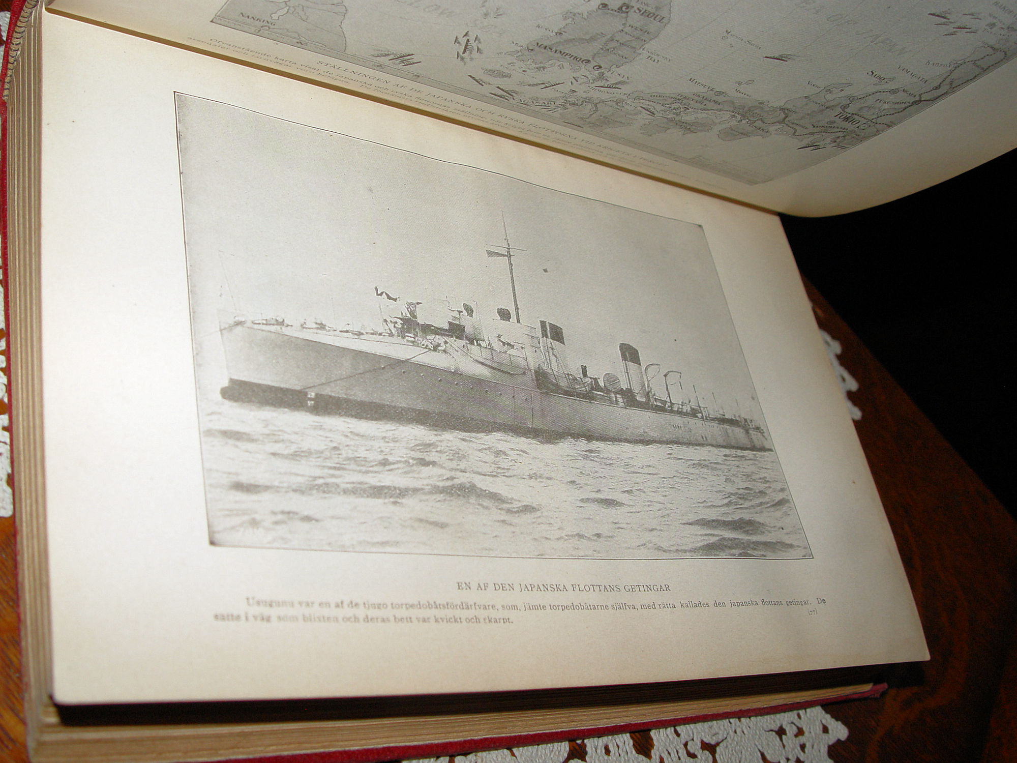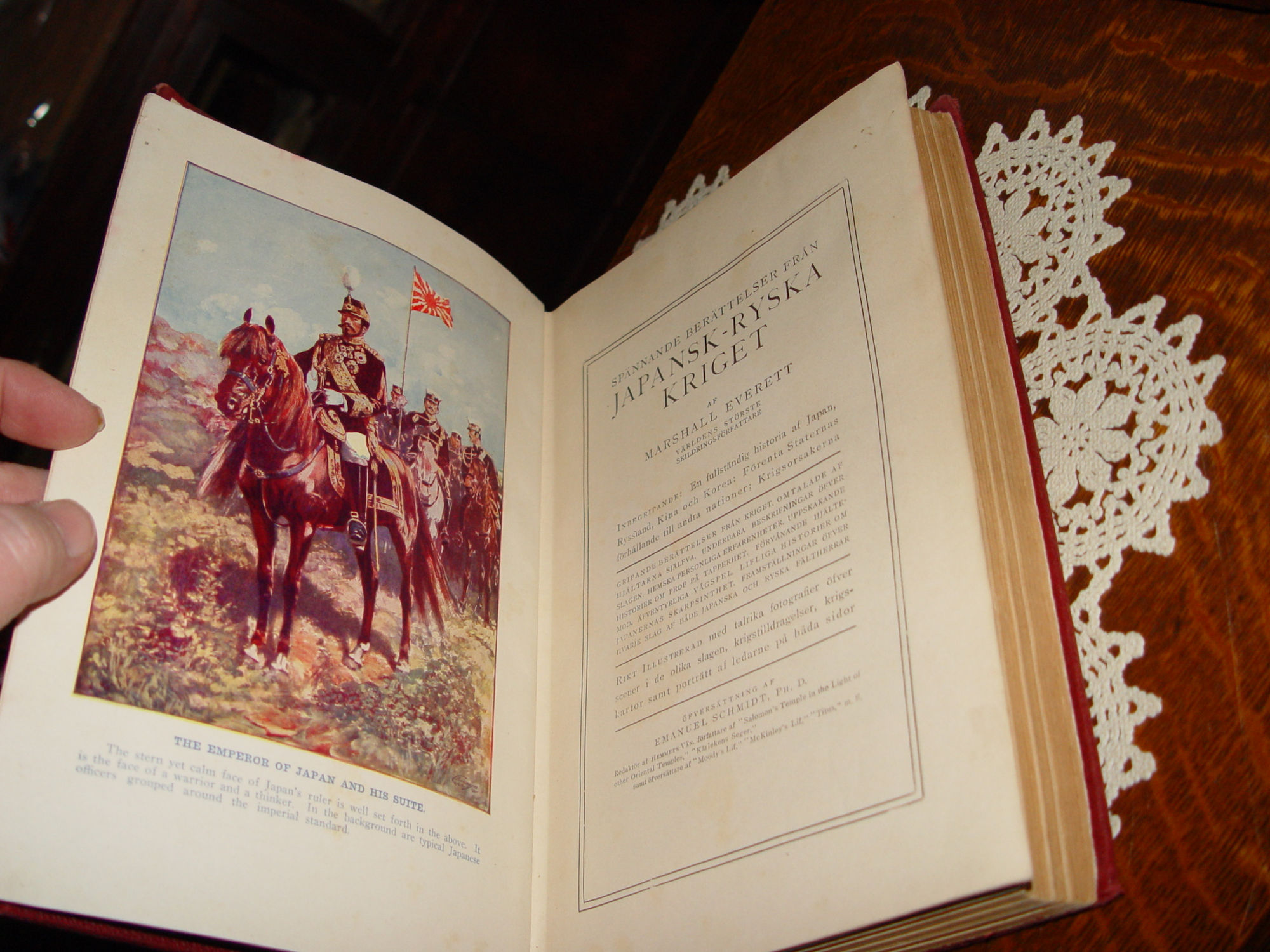 Published by Chicago: Educational Co., 1905 Marshall Everett Approx. Size: 11 x 8.5 -- 488 pages Language is Swedish. Translates 'Exciting stories of Japanese-Russian war' a full history of japan russia, china and korea United States' relations with other nations war causes The first page has a color page of the Japanese Emperor on a horse. Cover still attractive after all these years, deep red cloth with gold gilt decoration and lettering. It has some obvious wear but not enough to keep it from being an attractive addition to your library. Full page illustrations, most look like political drawings. Tthe book is complete, all the pages are bound together nicely, but there this has a broken hinge. Noticeable only when cover and endpapers meet. No writings other than the red ink inscription, previous owner and date 1907. Page 206 is torn. See photos and email with any questions prior to purchase. |
